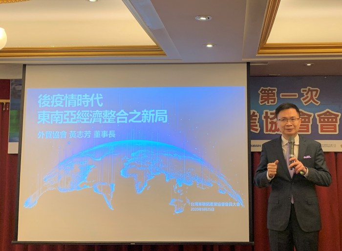 圖3:中華民國對外貿易發展協會董事長黃志芳分享「後疫情時代東南亞經濟整合之新局」,闡述在疫情影響之後,如何從全球趨勢、戰略思考、經營策略、四位轉型四個面向作新布局,並表示在車聯網方面會與TTIA有更密切的合作,攜手協助台灣廠商拓展車聯網市場。