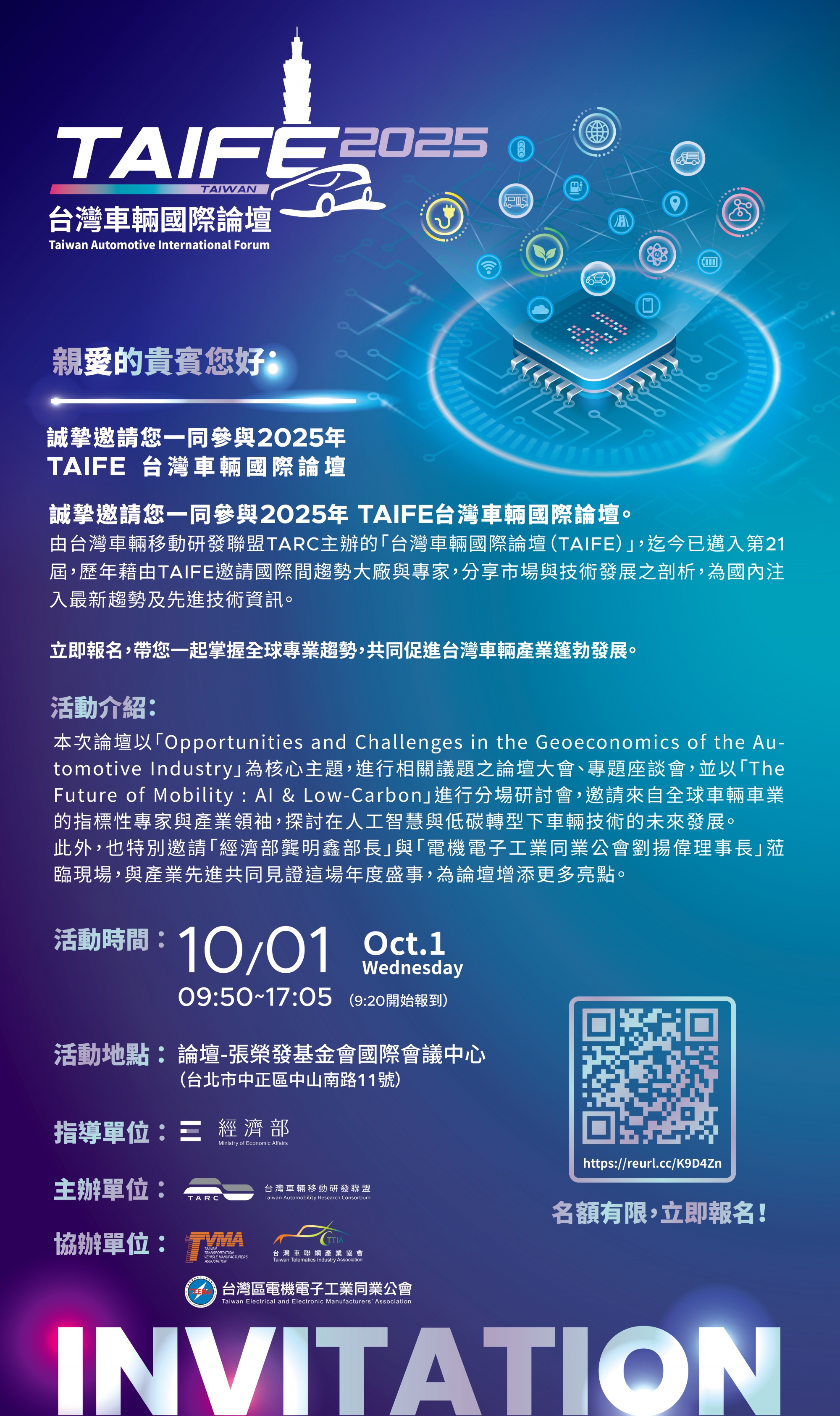 誠摯邀請報名10/1 「2025年TAIFE台灣車輛國際論壇」
