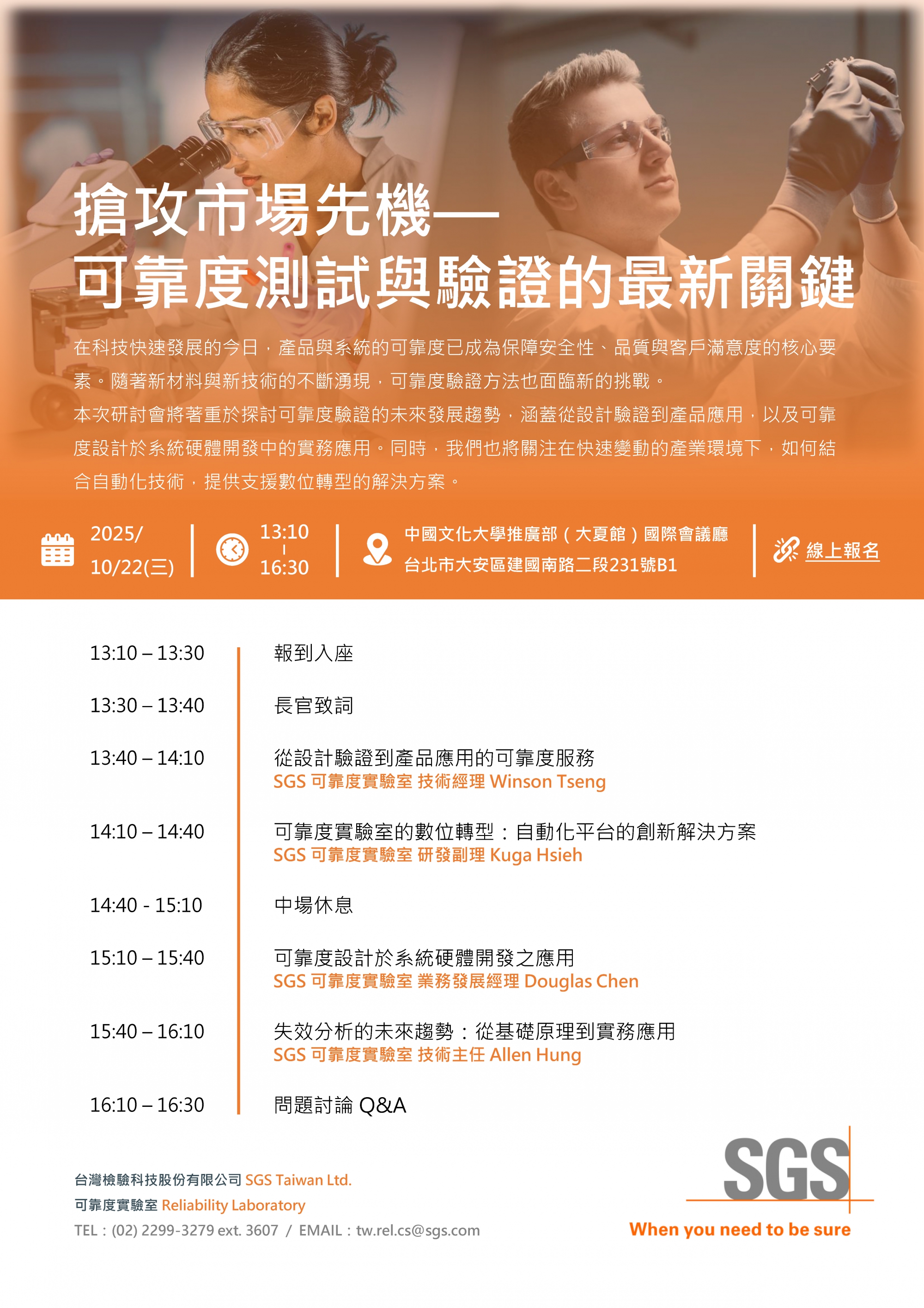 【免費報名】 2025 SGS 可靠度實驗室年度研討會_ 搶攻市場先機––可靠度測試與驗證的最新關鍵