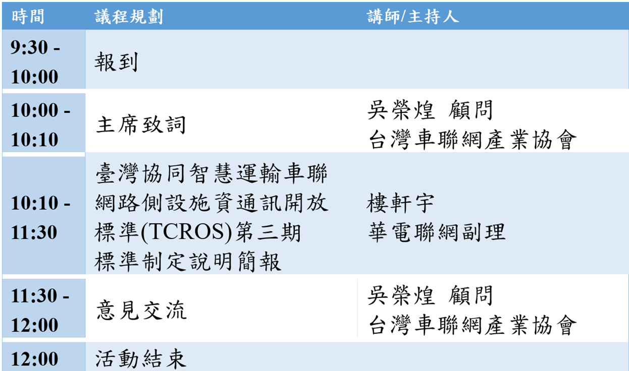 10/22「臺灣協同智慧運輸車聯網路側設施資通訊開放標準(TCROS)第三期第九次標準討論會議」(原10/15會議延期)