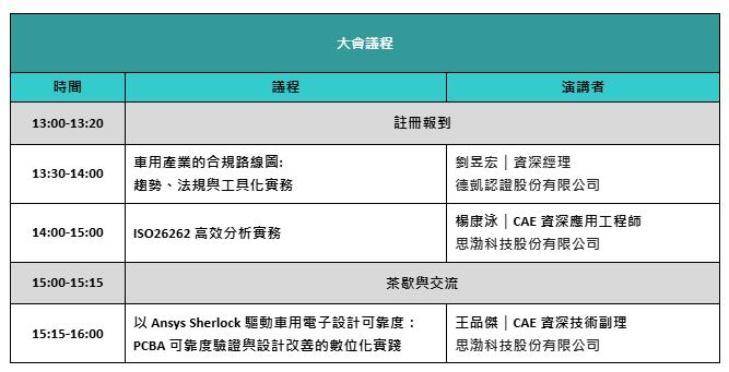 本次論壇將結合車用產業合規路線圖與最新法規趨勢,透過 Ansys 軟體實現 PCBA 可靠度數位驗證與設計改善,協助企業提前預測失效風險、縮短驗證時程並優化設計品質;同時分享汽車電子電性與可靠性驗證導入,以及 ISO 26262 & ISO 21434 認證諮詢實務,加速 OEM 導入與國際市場准入。
